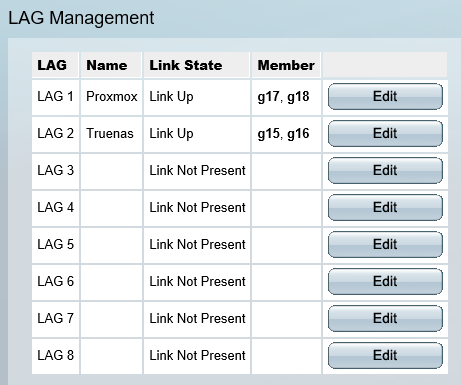 Next I configured both the LAG's by selecting Edit and moving the respective ports over (i.e g17, g18), selecting LACP and naming the LAG to remember what's set to what.